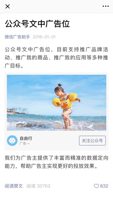 是基于微信公众平台生态,以类似公众号文章内容的形式在包括文章底部、文章中部、互选广告和视频贴片等 四个广告资源位进行展示的内容广告。