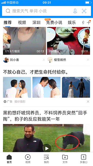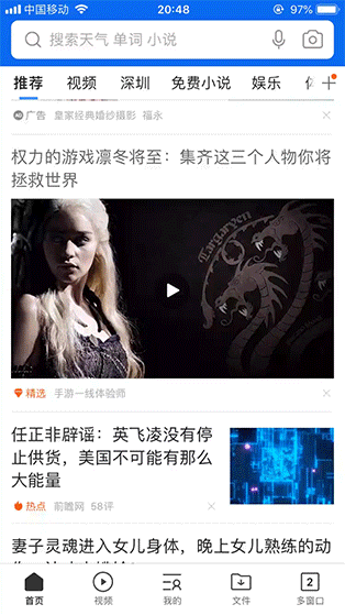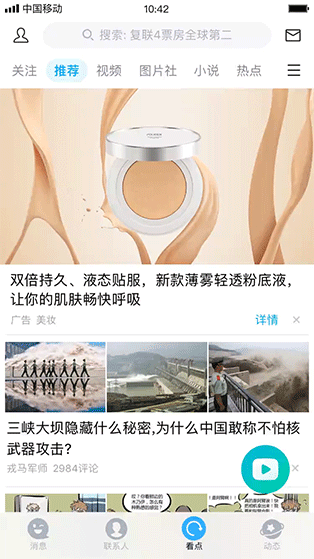 沉浸视频流:点击任意视频后进入沉浸视频流,滑动观看,则出现沉浸视频广告。视频全屏播放,感官刺激最大化,外部干扰少。